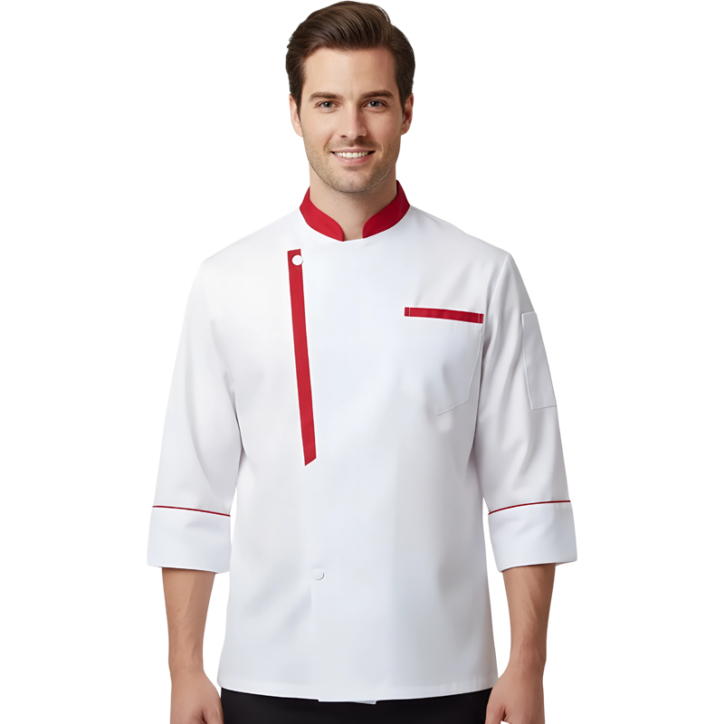 Découvrez notre chemise de cuisine professionnelle en serge, spécialement conçue pour répondre aux exigences des professionnels de la restauration au Maroc. Cette tenue allie élégance contemporaine et fonctionnalité avec son design asymétrique distinctif et ses finitions bordeaux raffinées.