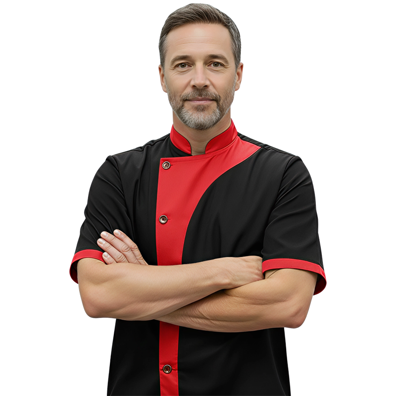 Chemise de cuisine professionnelle bicolore noir et rouge, design moderne avec finitions élégantes. Idéale pour les cuisiniers et restaurateurs exigeants.
