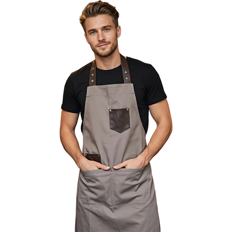 Tablier professionnel gris et noir élégant avec poches pratiques, idéal pour les artisans et professionnels exigeants. Protection optimale et confort garanti pour toute la journée.